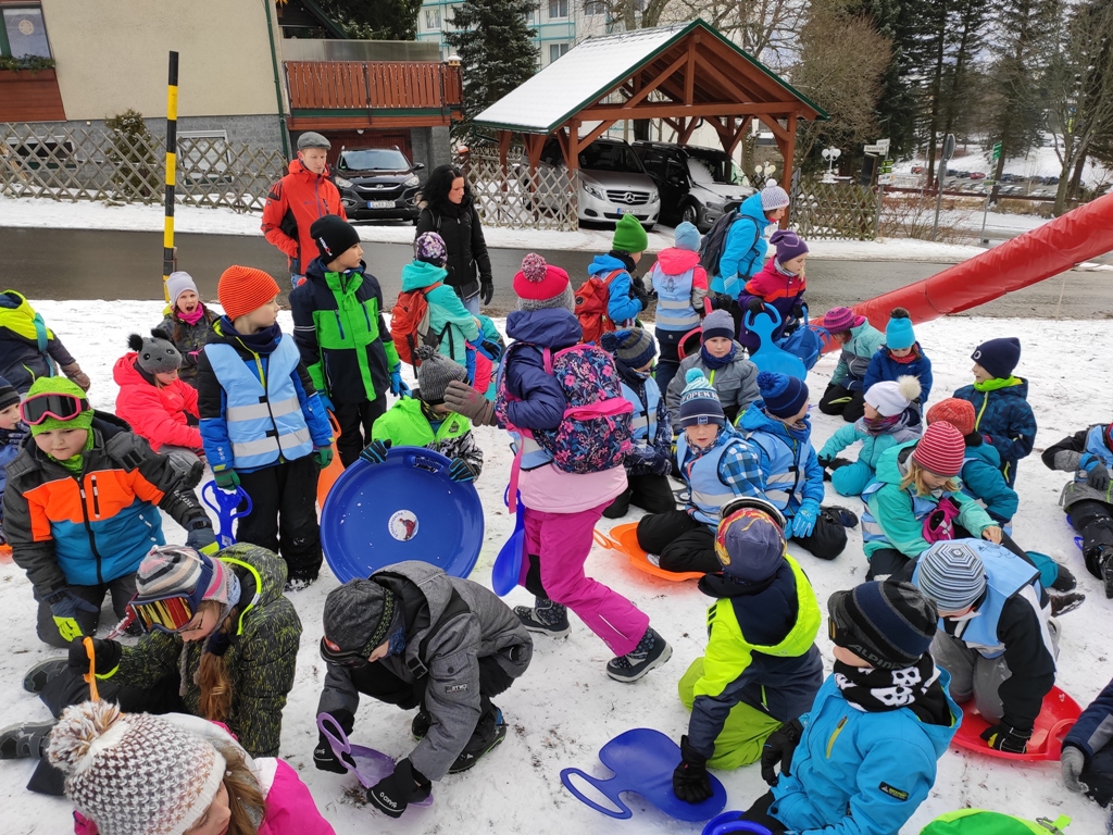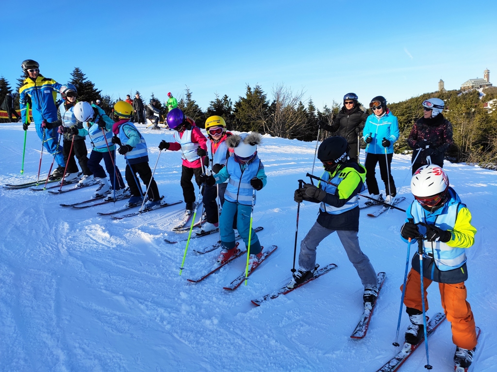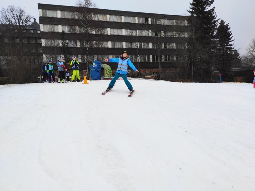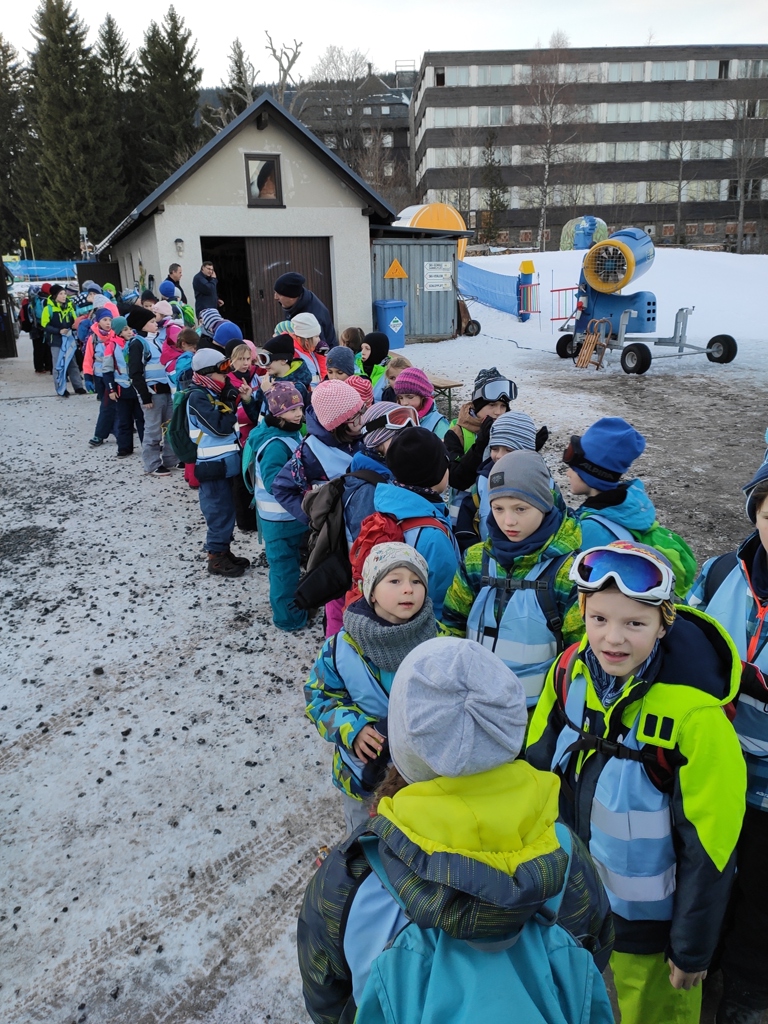 Es ist Montag der 20.01.2020, 08.30Uhr. Die Sonne scheint, die Vögel zwitschern und frühlingshafte Temperaturen bestimmen den Morgen. Auf der Warthaer Straße blockieren ein Reisebus und 52 wuselige Kinder, sowie deren Eltern, den Verkehr. Fleißig werden Reisetaschen und Skiausrüstung verladen. Skiausrüstung, bei diesen Temperaturen? Nach Oberwiesenthal soll es gehen, denn die Webcam verspricht beschneite Pisten. Die letzten Abschiedstränen werden getrocknet und dann bringt uns der Busfahrer sicher, entspannt und ohne Magenbeschwerden nach Oberwiesenthal. Dort beziehen wir als erstes die Zimmer im Hotel „Zum schwarzen Ross“. Anschließend geht es zum Rodelhang, wo noch ein paar Krümel Schnee liegen. Zum Rodeln reicht es auf jeden Fall, auch kleine Schneemänner werden gebaut. Vom Rodeln ganz hungrig, empfängt uns ein deftiges Essen im schwarzen Ross. Noch kurz die FIS Regeln besprochen und ein Winterquiz gelöst, dann geht auch schon ins Bett. Wie jeden Morgen, gib es am Dienstag zuerst ein kräftigendes Frühstück. Dann werden die Skisachen angezogen und nach einer kurzen Erwärmung geht es in Zweierreihe in die Skischule. Das Wetter ist fantastisch und könnte nicht besser sein. Jetzt heißt es, 52 Paar Kinderskischuhe anziehen, Verschlüsse zu klicken und ab auf die Piste. Mittagsroutine: 52 Paar Schuhe ausziehen, in den „Schuppen“ marschieren, stärken und wieder zurückmarschieren. Wieder 52 Paar Schuhe schließen und ein weiteres Mal auf die Piste. Spätestens am dritten Tag spüren alle die 52 Paar Schuhe in den Armen. Abends gibt es wie immer ein leckeres Essen und sowohl Dienstag als auch Mittwoch einen ausgiebigen Spieleabend. Am Donnerstag ist letzter Skitag. Heute dürfen auch die Anfänger auf die blaue Piste und stellen sich der Herausforderung wacker. Gekrönt wird das Skilager mit einer Disco am Donnerstagabend. Freitagmorgen heißt es dann packen, Sachen in den Bus laden und heimfahren, wo die Kinder schon sehnlichst erwartet werden.