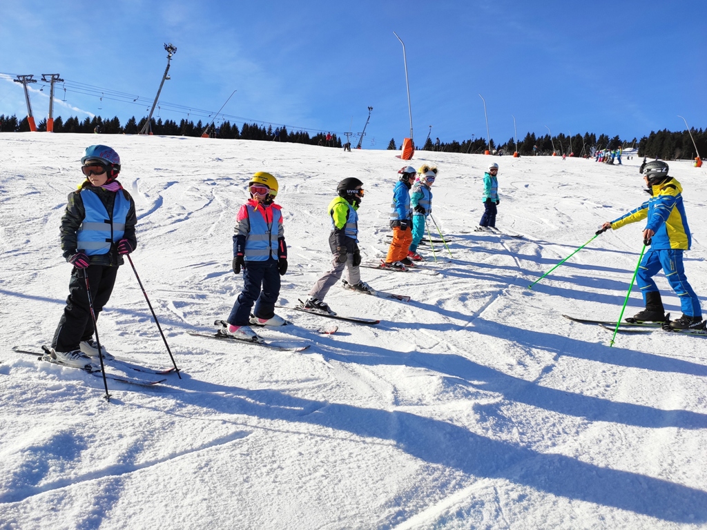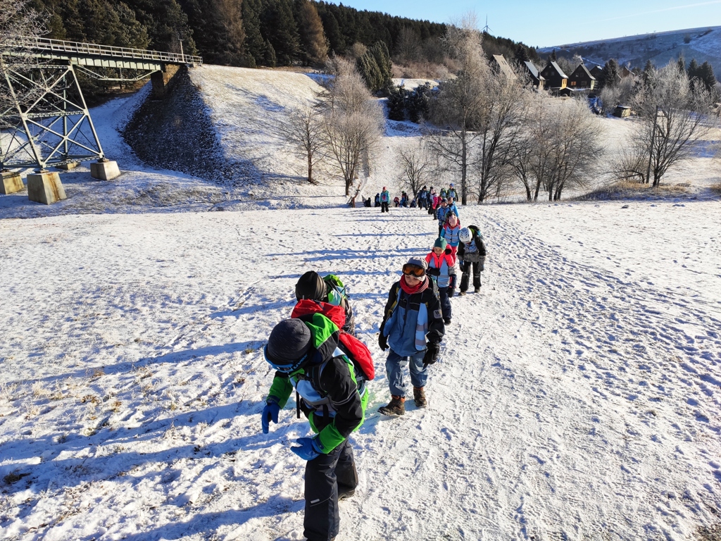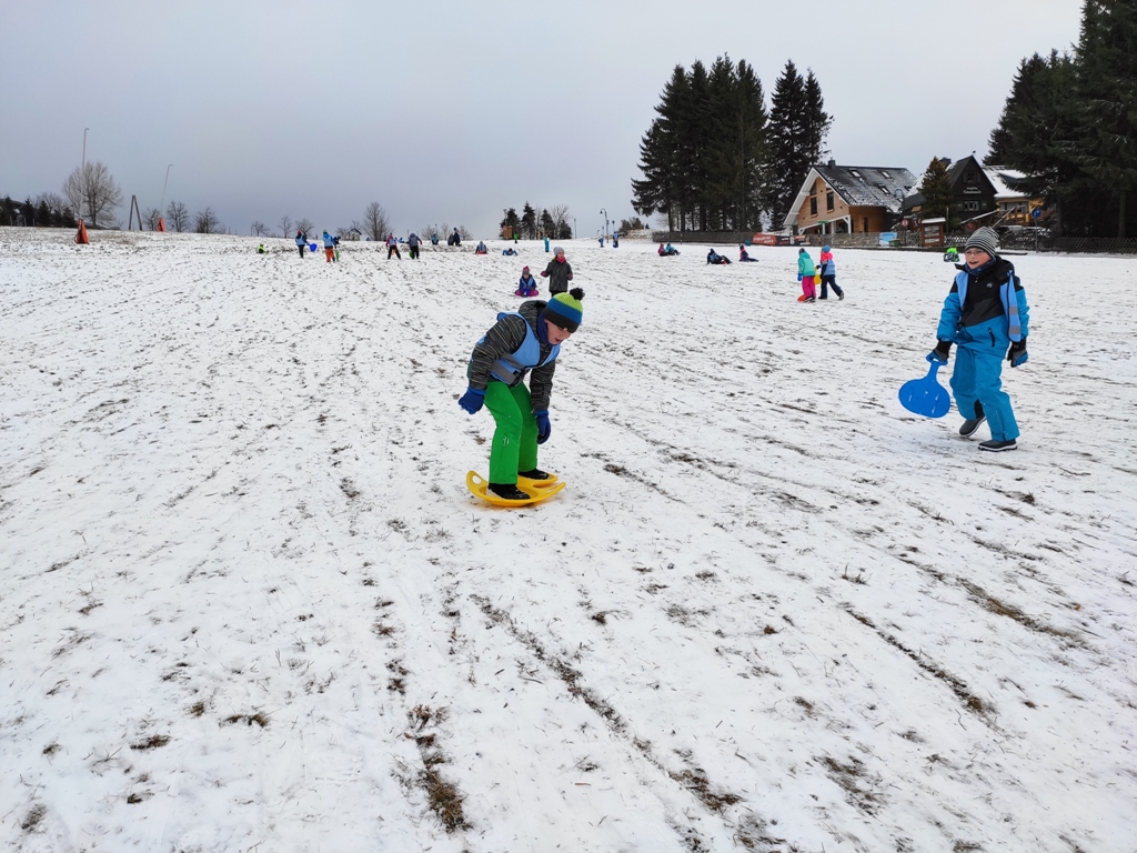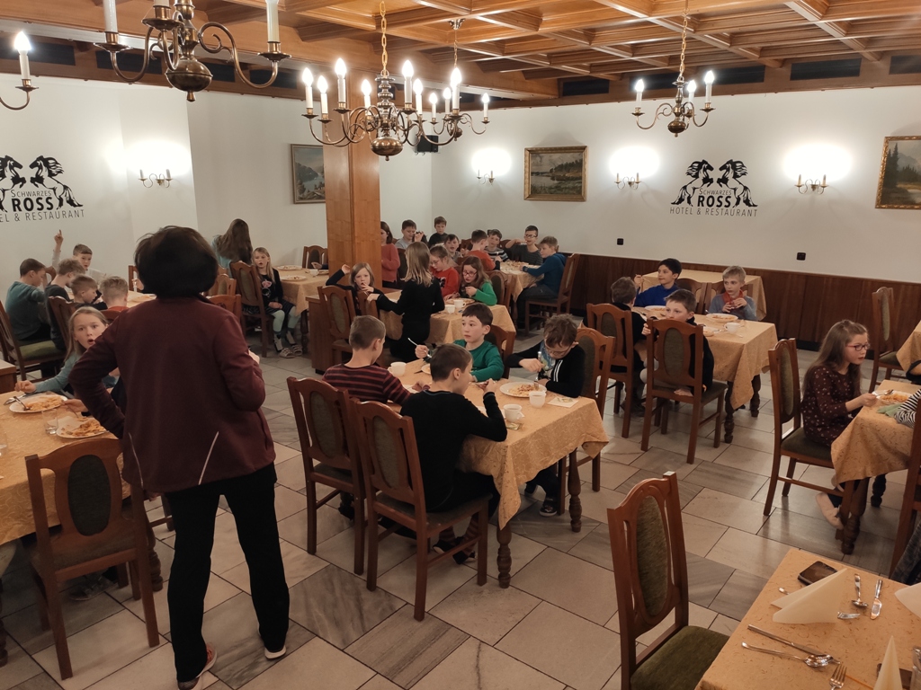 Es ist Montag der 20.01.2020, 08.30Uhr. Die Sonne scheint, die Vögel zwitschern und frühlingshafte Temperaturen bestimmen den Morgen. Auf der Warthaer Straße blockieren ein Reisebus und 52 wuselige Kinder, sowie deren Eltern, den Verkehr. Fleißig werden Reisetaschen und Skiausrüstung verladen. Skiausrüstung, bei diesen Temperaturen? Nach Oberwiesenthal soll es gehen, denn die Webcam verspricht beschneite Pisten. Die letzten Abschiedstränen werden getrocknet und dann bringt uns der Busfahrer sicher, entspannt und ohne Magenbeschwerden nach Oberwiesenthal. Dort beziehen wir als erstes die Zimmer im Hotel „Zum schwarzen Ross“. Anschließend geht es zum Rodelhang, wo noch ein paar Krümel Schnee liegen. Zum Rodeln reicht es auf jeden Fall, auch kleine Schneemänner werden gebaut. Vom Rodeln ganz hungrig, empfängt uns ein deftiges Essen im schwarzen Ross. Noch kurz die FIS Regeln besprochen und ein Winterquiz gelöst, dann geht auch schon ins Bett. Wie jeden Morgen, gib es am Dienstag zuerst ein kräftigendes Frühstück. Dann werden die Skisachen angezogen und nach einer kurzen Erwärmung geht es in Zweierreihe in die Skischule. Das Wetter ist fantastisch und könnte nicht besser sein. Jetzt heißt es, 52 Paar Kinderskischuhe anziehen, Verschlüsse zu klicken und ab auf die Piste. Mittagsroutine: 52 Paar Schuhe ausziehen, in den „Schuppen“ marschieren, stärken und wieder zurückmarschieren. Wieder 52 Paar Schuhe schließen und ein weiteres Mal auf die Piste. Spätestens am dritten Tag spüren alle die 52 Paar Schuhe in den Armen. Abends gibt es wie immer ein leckeres Essen und sowohl Dienstag als auch Mittwoch einen ausgiebigen Spieleabend. Am Donnerstag ist letzter Skitag. Heute dürfen auch die Anfänger auf die blaue Piste und stellen sich der Herausforderung wacker. Gekrönt wird das Skilager mit einer Disco am Donnerstagabend. Freitagmorgen heißt es dann packen, Sachen in den Bus laden und heimfahren, wo die Kinder schon sehnlichst erwartet werden.